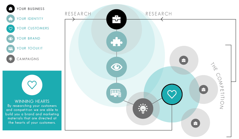 YOUR BUSINESS At the centre of everything is your business. This is how you operate, to what you offer and how you offer it to your customers. YOUR IDENTITY This is your voice, your essence and your personality. It is the most important substance to differentiate you from your competition. YOUR CUSTOMERS Your business heart is your customers. By learning about their individual requirements you can target the information they want to hear about, in turn increasing sales. YOUR BRAND This is the visual way to attract potential customers attention and create loyalty with existing customers. It should resonate with them and install all the values of your identity. YOUR TOOLKIT Your toolkit should consist of everything you need to communicate your brand to your customers. To name a few examples; business stationary designs, website, event stands, pens, uniforms, signage… CAMPAIGNS With all the above in place you are ready to attract new customers, and can begin targeting specific customers and have measurable results so you can continuously feed into your knowledge bank. Our Approach